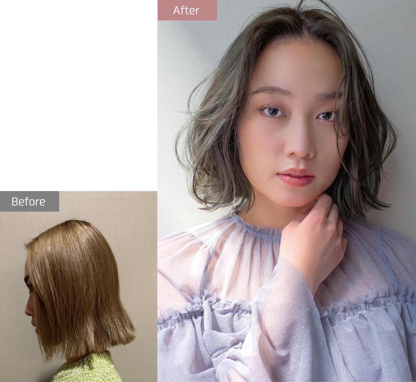 さらに、カラーを塗り分けることで、ダメージ部分のくすみを抑え、春にぴったりのやわらかく透明感のあるオリーブベージュを実現! その事例をご紹介します。