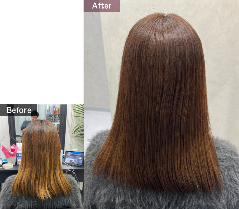 中間~毛先:ホームカラー+縮毛矯正履歴あり(3~4か月)