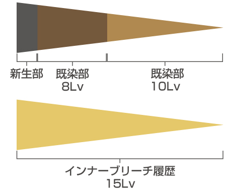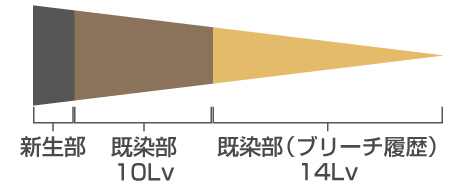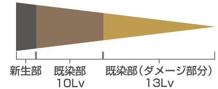 新生部3㎝、既染部(中間まで)10Lv、既染部(中間~毛先)13Lv