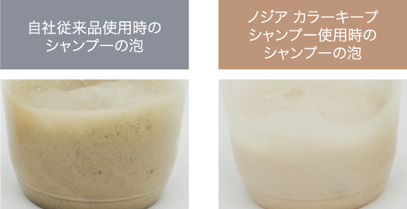 NODIA カラーキープシャンプーは、ノニオン(=non ion)洗浄成分を中心に配合することにより、イオン結合で髪に吸着した塩基性染料への影響を抑え、色持ちを高めます。