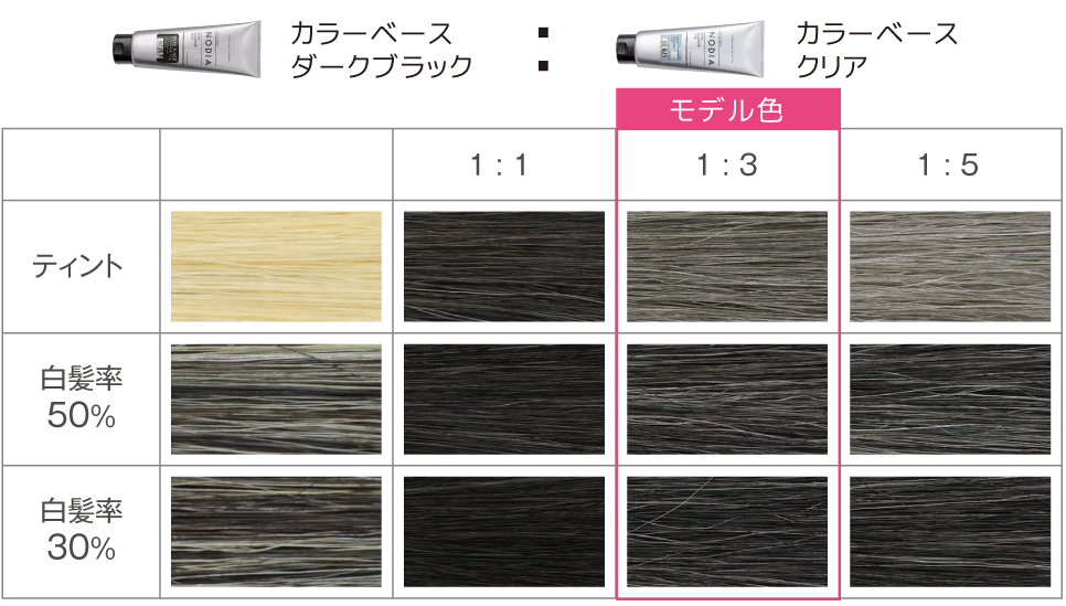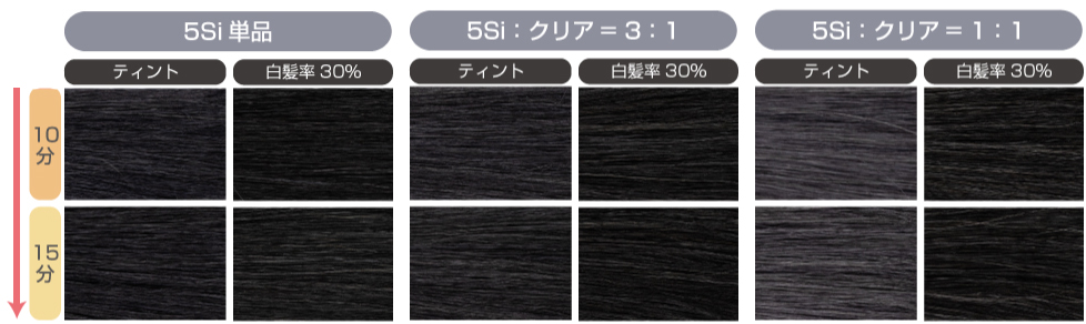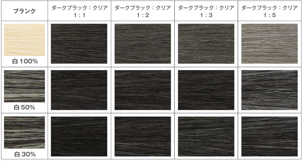 白髪率が高い方だと、ブラックをクリアで薄めた色味で白髪ぼかしが可能です。