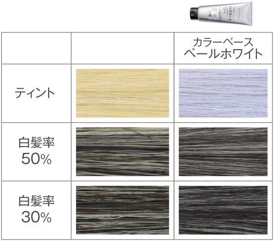 紫味を含むペールホワイトを使用すると、黄ばみを抑え、清潔感のあるグレイヘアーに