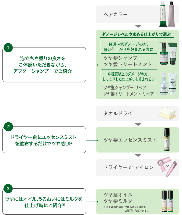 • ツヤ髪ミルク:普通毛~軟毛で自然なまとまり感を高めたい時