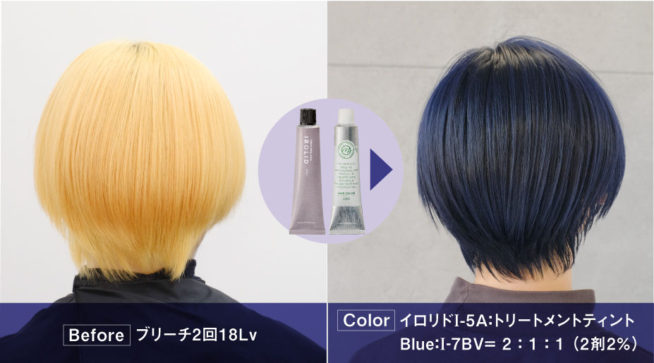 • ブリーチ1回で18Lvに整えてから5Lvのアッシュ+コントロールカラーBlue+補色のバイオレットをMixしてオンカラー。