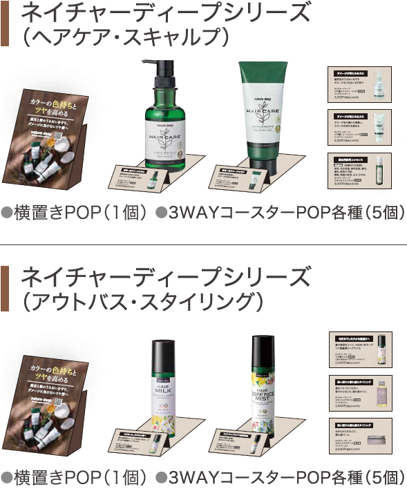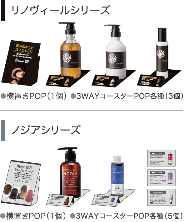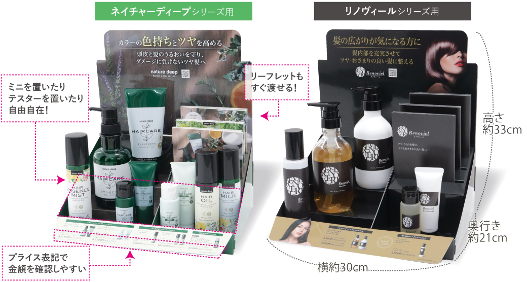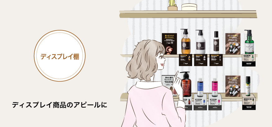 店販は、お客さまからご興味を持っていただけると、自然にご紹介ができて、お話しやすくなりますよね。そんな店販をサポートするディスプレイツールから、皆さまのご要望にお応えして、セット面に置きやすい小型サイズで、自由に選んで置ける『店販ディスプレイセット』を新たに発売いたしました。