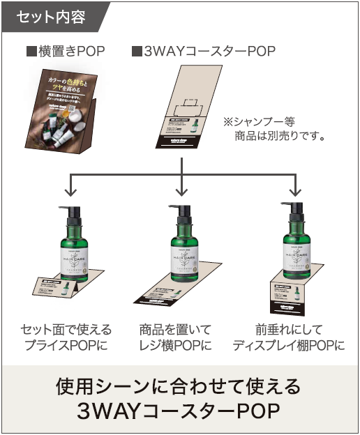 セット内容は、横置きPOPと、各種3WAYコースターPOP。3WAYコースターPOPは、使用シーンに合わせて形状を変えてディスプレイできます。
