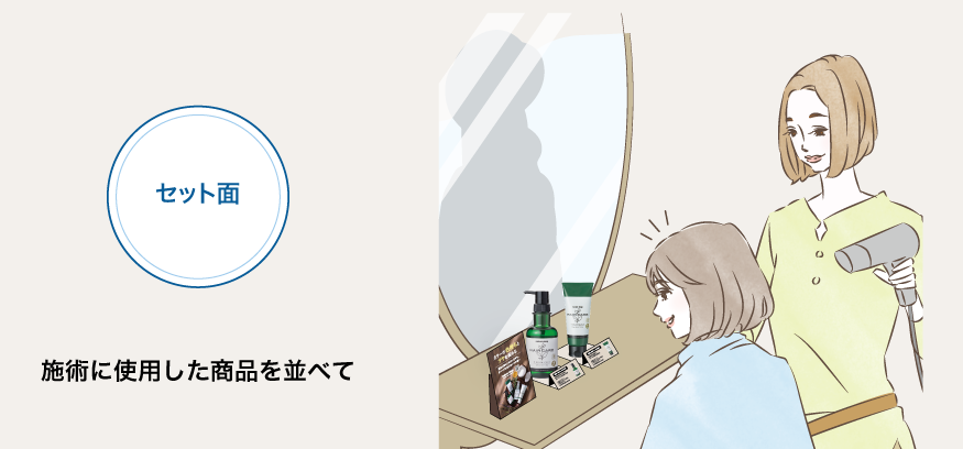 セット面には、仕上げに使用するアウトバストリートメントやスタイリング剤を置き、「今日はこちらを使用しますね」と使用方法などをお伝えすることで、お客さまに興味を持っていただけます。テスターとして置くことで、その場で触っていただくこともできます。