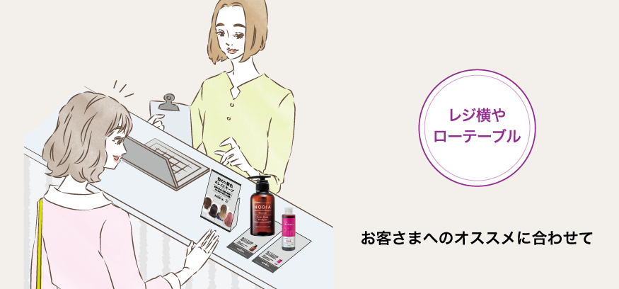 「レジ周りは立ち止まる時間も長く、支払いでうつむくため目に入りやすい」と店販のゴールデンポイントでも言われるレジ横では、お客さまにオススメしたい商品を置きましょう。また、スタイルを長く保つために必要なケアについて説明する機会にもつながり、お試し用のミニサイズをお渡しするきっかけにもなります。