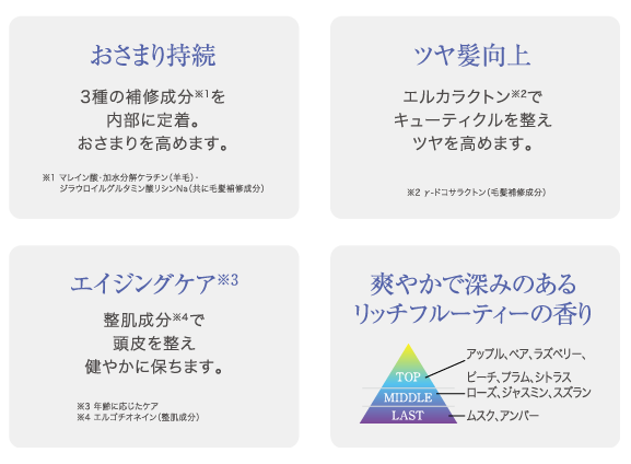 ※1 マレイン酸、加水分解ケラチン(羊毛)、ジラウロイルグルタミン酸リシンNa(全て毛髪補修成分) ※2 γ-ドコサラクトン(毛髪補修成分) ※3 年齢に応じたケア ※4 エルゴチオネイン(整肌成分)