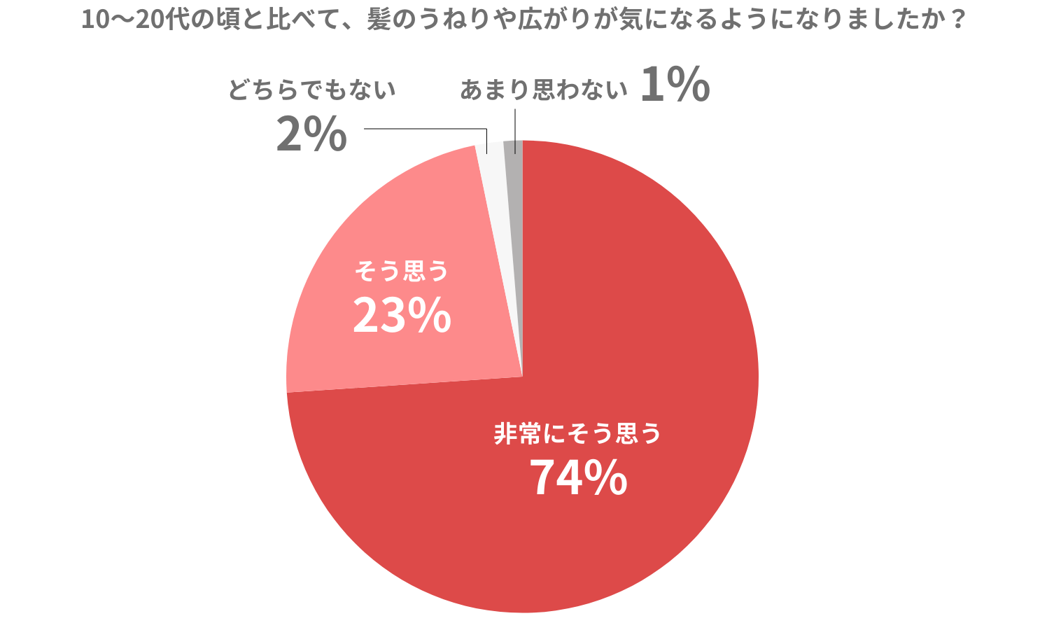 「10~20代の頃と比べて、髪のうねりや広がりが気になるようになりましたか?」と伺ったところ、なんと97%の方が「そう思う」と回答!