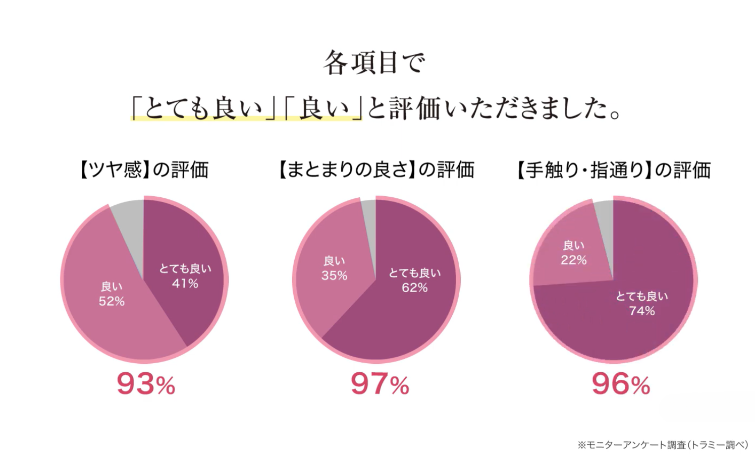 93%以上が「ツヤ感」「まとまり」「指通り」が良いと回答