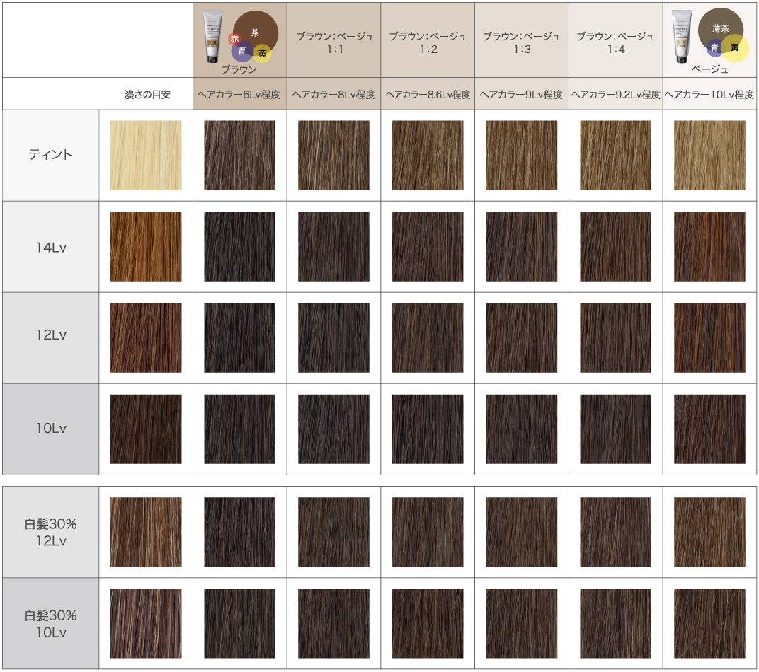 ブラウン~ベージュ(アルカリカラー6~10Lvの濃さ)の色味について