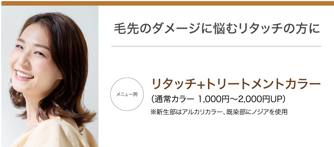 そこで、既染部の明るさをキープしたい場合は、新生部のリタッチにはアルカリカラーを使用し、既染部にノジアのブラウン~ベージュを使用することで対応可能です。(※ジアミンアレルギーの方には対応できません。)