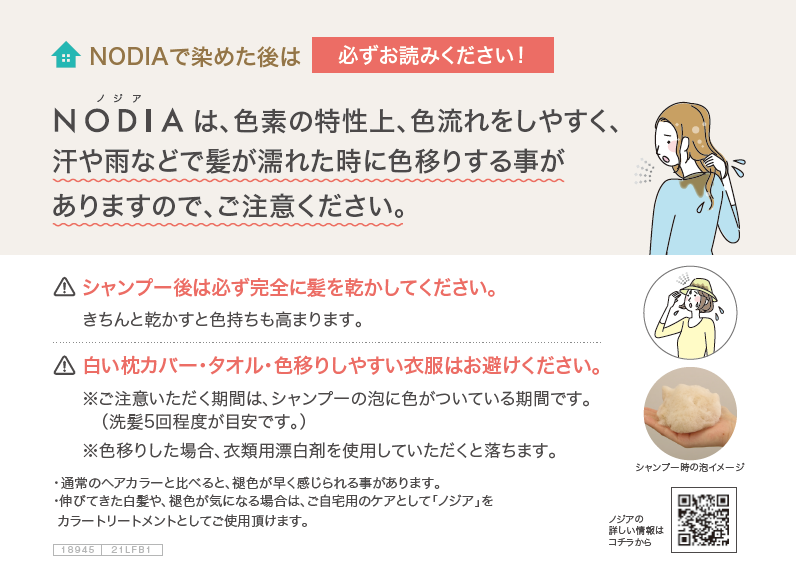 ノジアは使用している塩基性染料・HC染料の特性上、シャンプー時や髪が濡れている時に色流れしやすく、タオル等に色移りする可能性がございます。(洗髪5回程度までの期間)