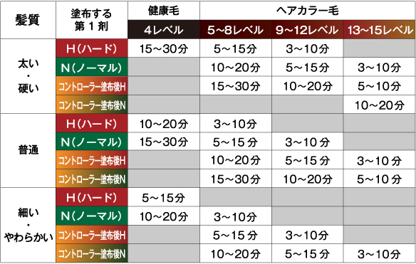 太く硬い健康な髪には『長めの放置タイム』がポイントです。まずは15分を目安に軟化チェックを行い、軟化不足であれば新生部を中心に重ね付けをしてください。ゆっくり浸透・軟化することでやわらかい手触りツヤのある自然なスタイルに仕上がります。