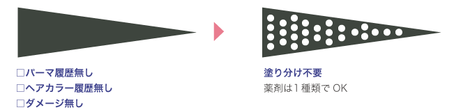 - ダメージもストレートやヘアカラーの履歴も無い場合は1種類の薬剤でもOK