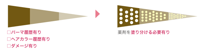 ※ストレート履歴の無い部分はヘアカラー履歴によるダメージを考慮して根元と中間で2段階で塗りわけ