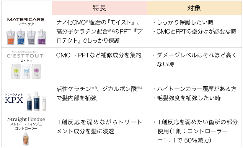 処理剤やコントローラーでの保護を行った上で、さらに1剤強度の選定を行っていく必要があります。