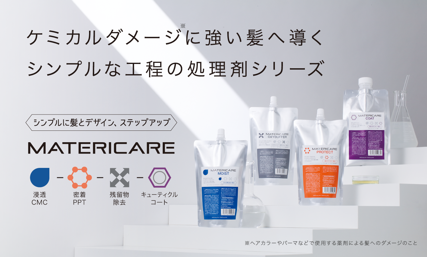 ムーランエムーランでは2023年9月にマテリケアを発売!最大4アイテムで事前処理~トリートメント仕上げまで完結し、ダメージ補修力・防止力を向上させた処理剤シリーズです。既存の処理剤と併せて、使用目的や違いをご紹介します!