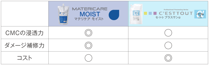 ※マテリケア『モイスト』はナノ化CMCを使用しているため、セ・トゥ『プラスサンα』よりも浸透力が高く、またCMCの配合濃度も高くなります。