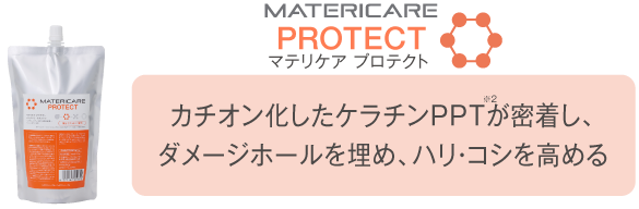 ※マテリケア『プロテクト』ではダメージホールを埋める高分子ケラチンPPT、『KPX1』には髪の内部の結合を補強する活性ケラチンが配合されています。