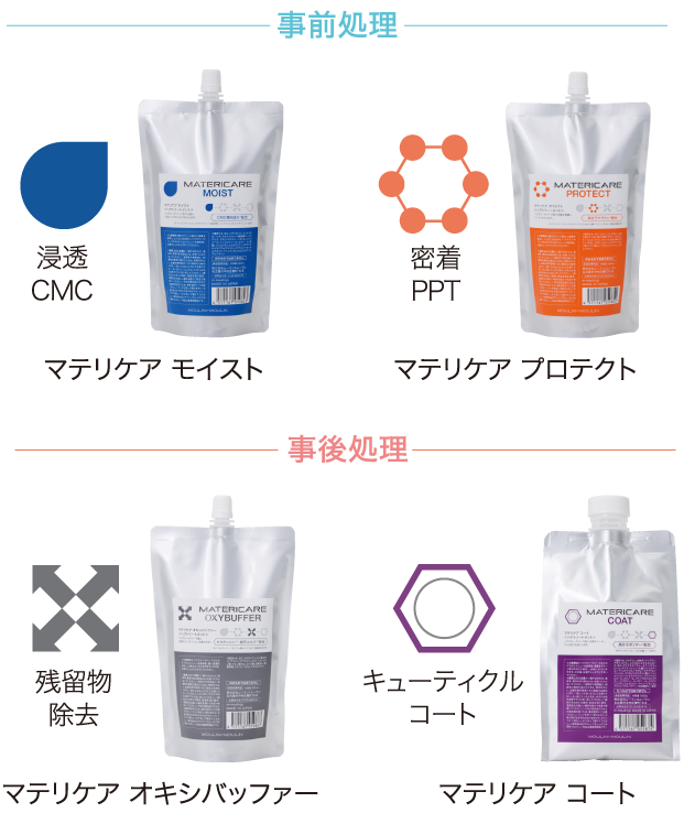 マテリケアはケミカル施術の仕上がりをワンランクアップさせることができる処理剤シリーズ。