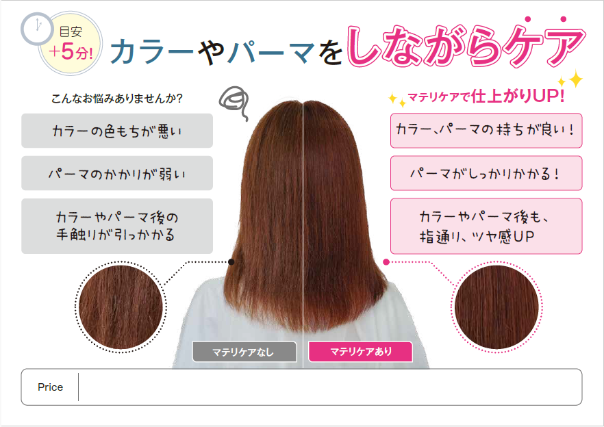 処理剤のマテリケアを時短ケアメニューとして導入し、通常のカラー・パーマメニューの単価アップに繋がったサロンさまの事例をご紹介しております。マテリケアを使用したメニュー化のご参考に是非ご覧ください。