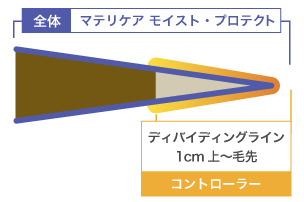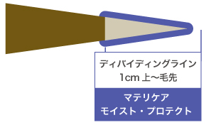 - ダメージの気になる中間~毛先をマテリケアモイストとプロテクト順序で事前処理し、チリつきとかかりムラを予防。※このとき、ダメージの気になるディバイディングラインの1cm上から処理剤を塗布。