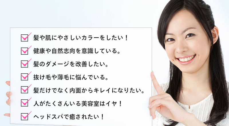 | アルカリは髪にも頭皮にも残るので、そのままにしておくと髪が傷むだけでなく、頭皮の老化にまでつながるそうですよ。今までの髪の悩みも残留アルカリが原因かもしれませんね。傷みの原因を残したまま帰りますか?アルカリができるだけ残らないようにするためには、髪の負担をリセットする必要があります。ですので、当店ではアルカリの比較的少ない薬剤*を使用した上で、さらに皆さまにトリートメントを必ずさせていただいております。 |