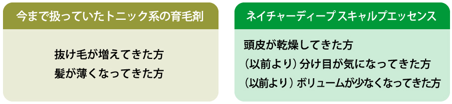 こちらからは話にくい内容なので、お客さまから相談されたら、ご案内する程度でしたね。ネイチャーディープ スキャルプエッセンスは「頭皮の乾燥」「分け目が気になってきた」「ボリュームが少なくなってきた」とありましたので、ご紹介するターゲットの印象が違いました。